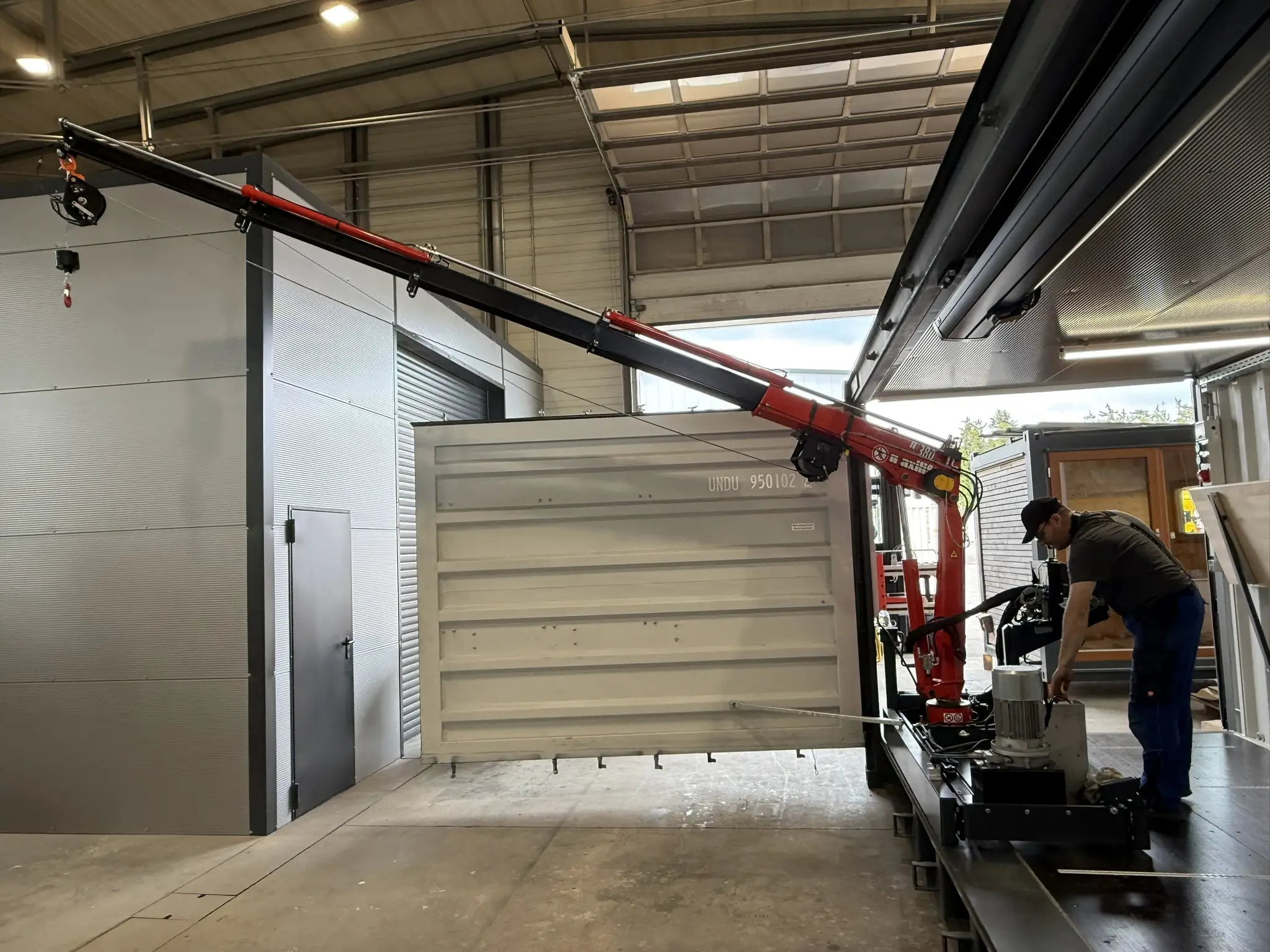 Ein zentrales Element des Containers ist der leistungsstarke Kranarm, der auf einer mobilen Plattform im Container montiert ist. Dieser kann entlang der Konstruktion verfahren und bei Bedarf direkt aus dem Container herausgeschwenkt werden.