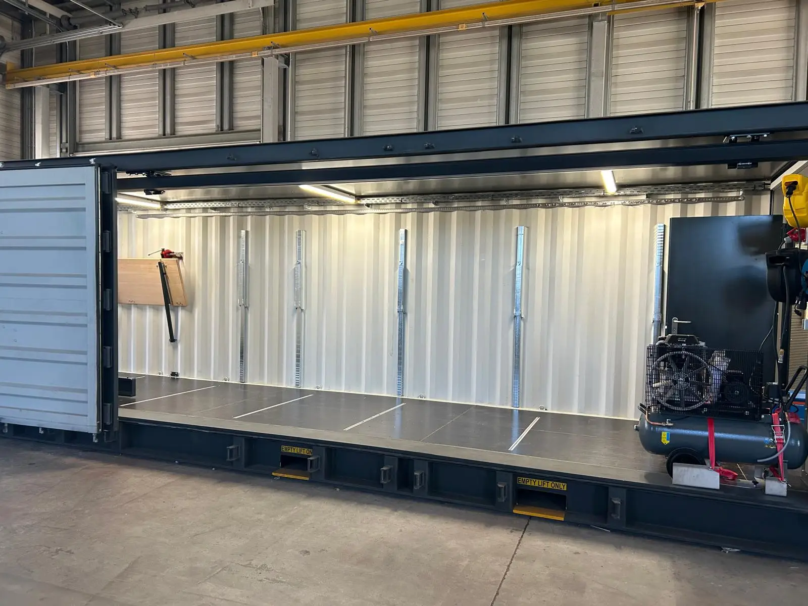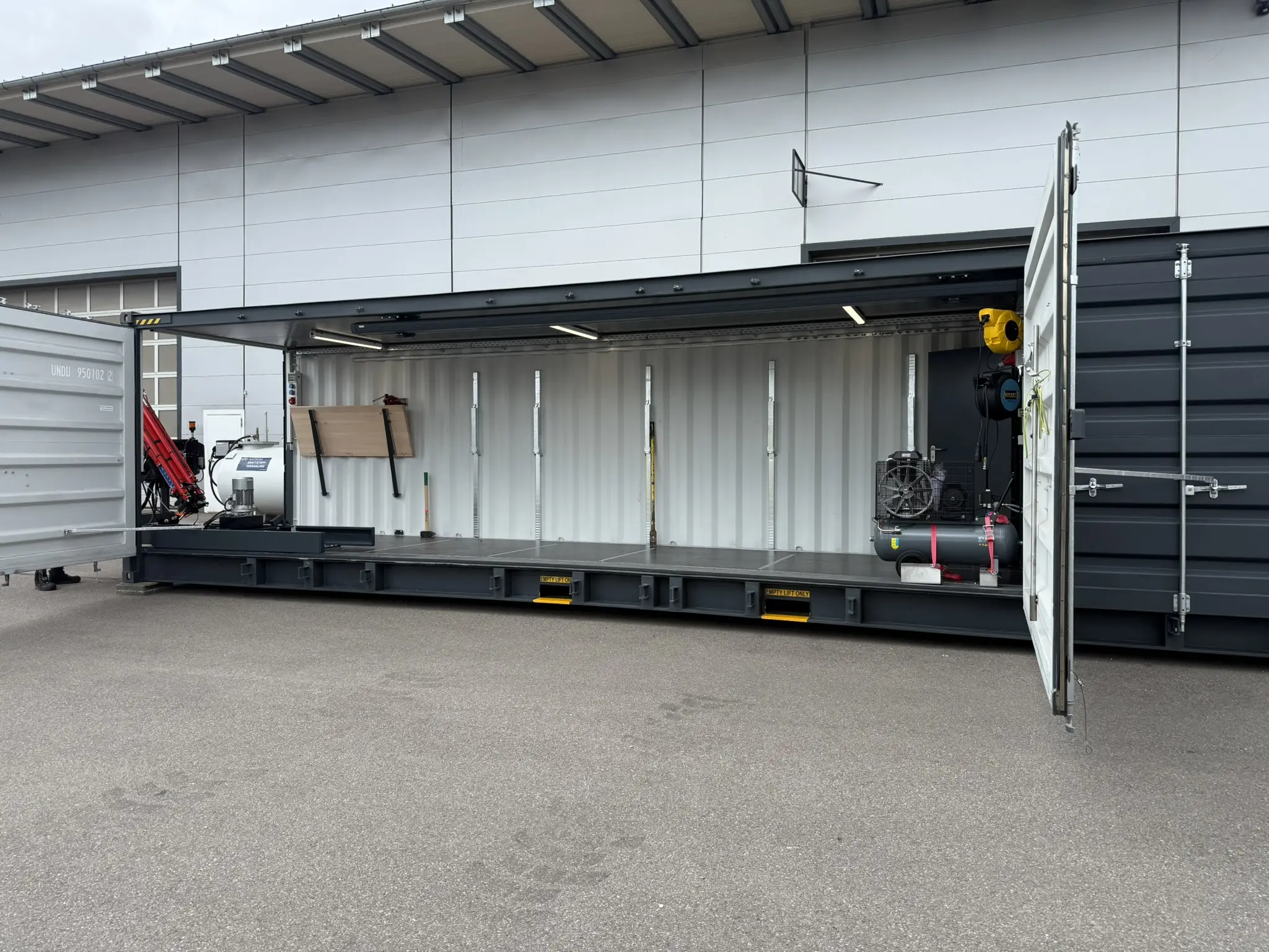 Neben der Arbeitsfläche bietet der Container großzügigen Stauraum für Werkzeuge, Ersatzteile und Ausrüstung. Alle Komponenten sind übersichtlich angeordnet und schnell zugänglich.